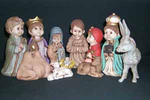 Large Children Nativity set contains 11 pieces and is approximately 8" tall. Slip cast from commercial molds and hand detailed.